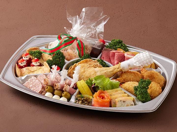 骨付き鶏もも肉の唐揚げ カレー風味 /ローストビーフ 香味ソース /フライドポテト/オマール風味クリームコロッケ /キッシュ/スモークサーモントラウト /エビサフランテリーヌ /合鴨ロースパストラミ、モッツァレラチーズとオリーブのピンチョス /パテ・ド・カンパーニュ /シーフードマリネ /サンタクロースに見立てたトマトとクリームチーズ