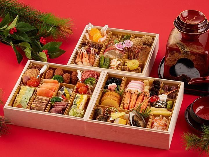 黒豆煮、梅花餅、紅蒲鉾、白蒲鉾、牛蒡煮、鮭昆布巻、芋きんとん、渋皮栗甘露煮、伊達巻、海老艶煮、二色梅ゼリー串、片口鰯の田作り、空豆塩煮、数の子醤油漬け、穴子八幡巻、市松錦玉子、鮑醤油煮、大根と金時人参のなます、パストラミビーフ、合鴨オレンジソース煮、ドライトマトのワイン煮、蟹と海藻のテリーヌ、デミグラスハンバーグ、ブロッコリーコンソメ煮、紅鮭スモーク、サーモンクリームチーズ、にしんとパプリカのマリネ、チーズと香草入りミートローフ、キノコと玉葱のグレービー、ローストビーフ、ボロニアソーセージ、ベーコンとパプリカの大根マリネ、かぼちゃのキッシュ、枝豆のマスカルポーネチーズ和え、マンゴー風味わらび餅、中華くらげ、山くらげの胡麻和え、ごま団子、まぐろの角煮ごま和え、クランベリーとクルミのシロップ煮、紅チャーシュー、チキンとチーズの二色焼き、鰊と小松菜の数の子和え、紅ズワイガニの柚子酢漬け、いか中華、胡瓜の柚子風味マリネ、豚の角煮、柚子皮甘煮